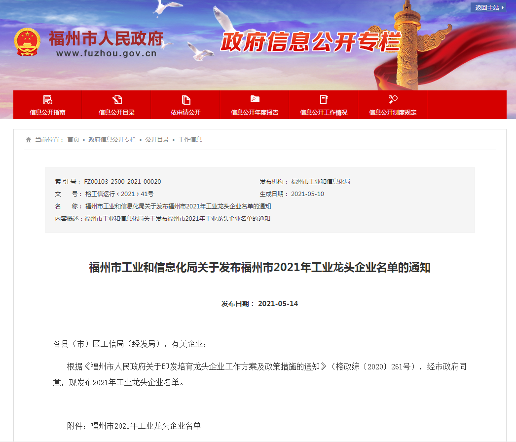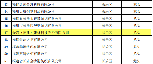 近日,福州市工业和信息化局公布了2021年福州市工业龙头企业名单,金强建材榜上有名,荣获福州市工业龙头企业。