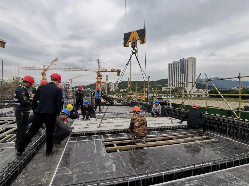 海月龙峰项目位于福建省福州市仓山区南二环路南侧,则徐大道东侧。工程总建筑面积为386315.00㎡,由39栋住宅、2栋公建、1栋组合建筑、多栋商业及配套组成。其中有18栋楼为装配式建筑,比例为50.15%,采用装配整体式混凝土结构体系和金强PC的预制叠合板、预制楼梯、预制挑板(部分楼栋)等预制构件。
