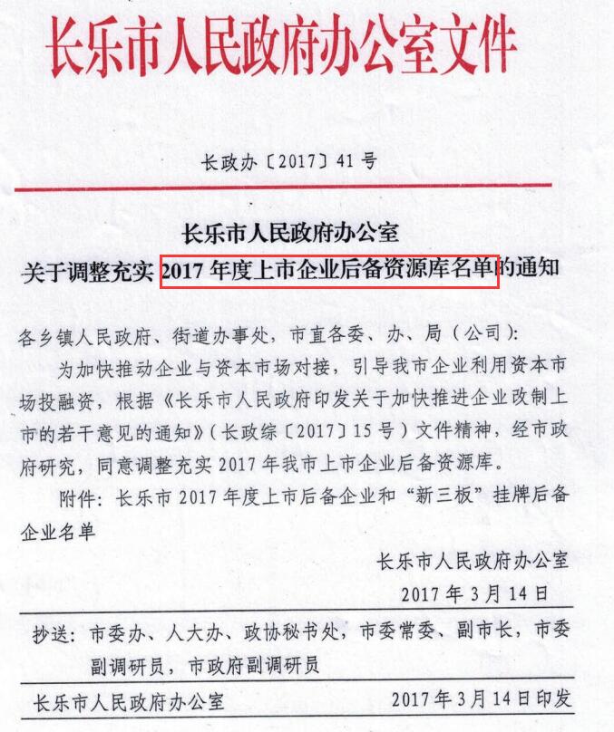 ▲金强建材科技被列入长乐市2017上市后备企业