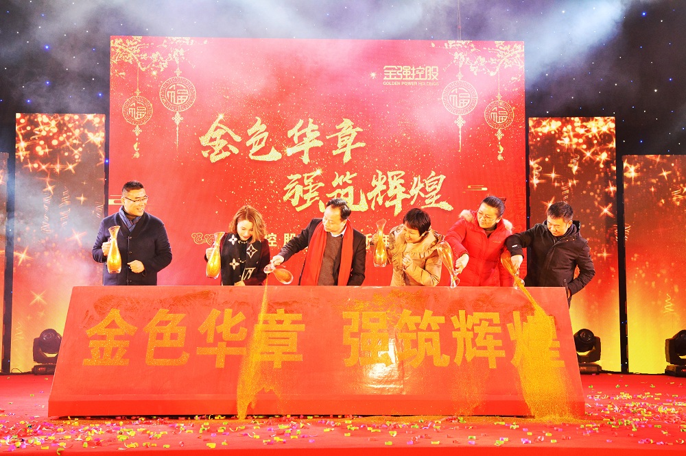 由金强控股集团董事长刘金铃以及董事长夫人、集团总裁翁斌、知识产权中心总监王爱群、财务中心总监卞晓丽以及子公司金强建材总经理黎忠和手握象征财富的金沙,向启动台上缓缓撒下,“金色华章•强筑辉煌”八个字渐渐显现,代表着2018金强控股新年年会正式启动!