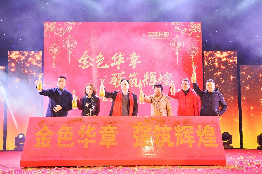 由金强控股集团董事长刘金铃以及董事长夫人、集团总裁翁斌、知识产权中心总监王爱群、财务中心总监卞晓丽以及子公司金强建材总经理黎忠和手握象征财富的金沙,向启动台上缓缓撒下,“金色华章•强筑辉煌”八个字渐渐显现,代表着2018金强控股新年年会正式启动!