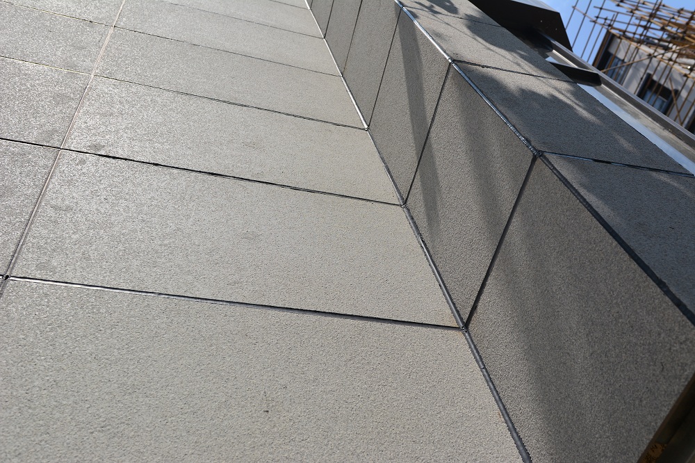 此外,由于金强ETT仿石单板表面涂层均匀分布SIO2粒子,具有超强的亲水性,使水珠产生荷叶效果,使得大气硫化物,污迹不易粘牢,仅悬浮于表面,遇到雨天则将被冲洗干净,自洁功能强大。
