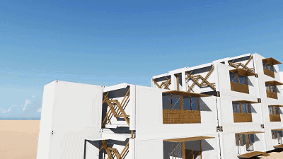 其实,这个模块化房屋就是大大小小的集装箱。而集装箱内所有的内部配件和固定装置都会预先安装,更重要的是这个模块化系统是可逆的,这就意味着它同样可以通过折叠回单元箱之后移动位置。
