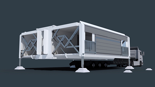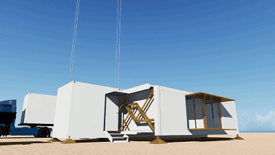 该模块化房屋极具特色:可以自动展开并部署房屋结构。整个过程不需要房屋建筑商介入,也不需要打任何房屋地基,仅需要不到10分钟的时间。