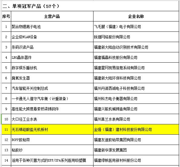 2018年9月10日,福建省经济和信息化委员会公布了福建省第二批制造业单项冠军企业(产品)名录,金强(福建)建材科技股份有限公司的“无石棉硅酸盐无机板材”榜上有名,荣获单项冠军产品。