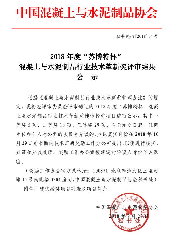 2018年9月29日,中国混凝土与水泥制品协会公布了2018年度“苏博特杯”混凝土与水泥制品行业技术革新奖评审结果。金强(福建)建材科技股份有限公司的TKK栈道板荣获技术开发类二等奖。