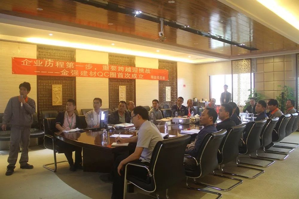 在2018年精益项目中,金强建材首个QCC(Quality Control Circle 即品管圈)成立是其重点工作之一。金强建材首个QCC于2018年9月4日正式成立,历经2个多月的努力,2018年11月13日,首个QCC——晨曦圈完美结案。生产中心设备部陈发霖作为圈长在会议上分享QC成果。
