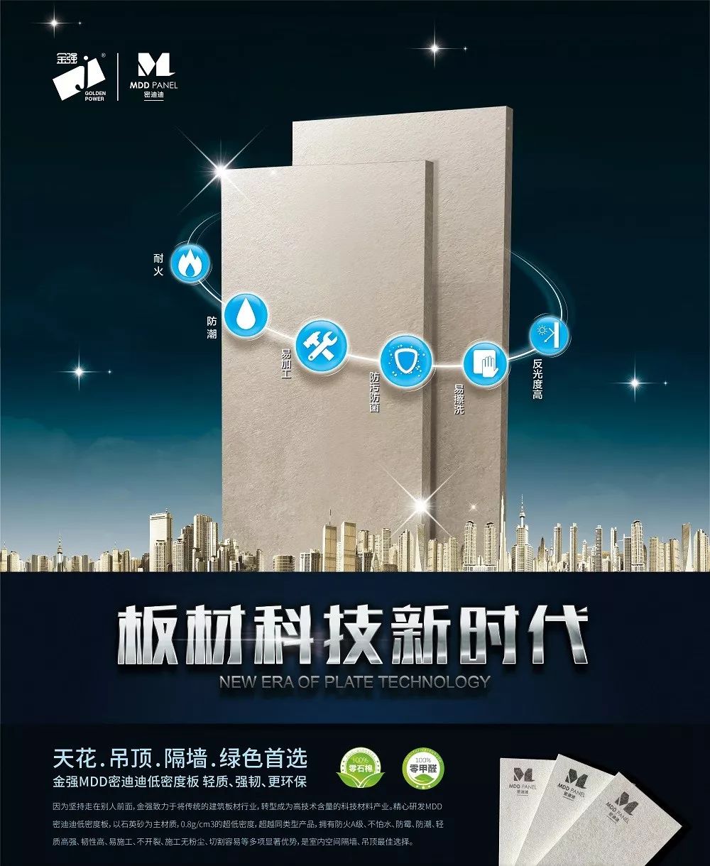 金强MDD板以石英砂为主要材质,板材密度≤0.8g/cm3,该超低密度超越同类型产品。板材轻质高强,无需引孔,易切割,施工容易,缩短工期。金强MDD板拥有卓越的防潮、防霉等性能,防火等级达防火等级A1级不燃性,安全系数高。