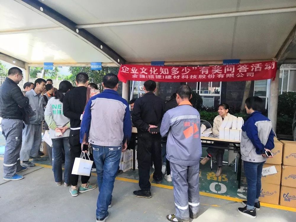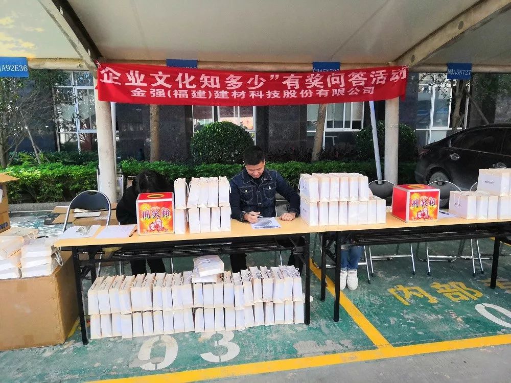 企业文化是一个企业信奉的价值观,对企业的领导者和职工起凝聚作用。为了进一步加深广大员工对企业文化的了解,增强员工参与企业文化建设的积极性,促进公司广大员工在日常工作中更好的践行公司企业文化,2018年12月11日上午,金强控股集团于东大园区开展“企业文化知多少”活动。