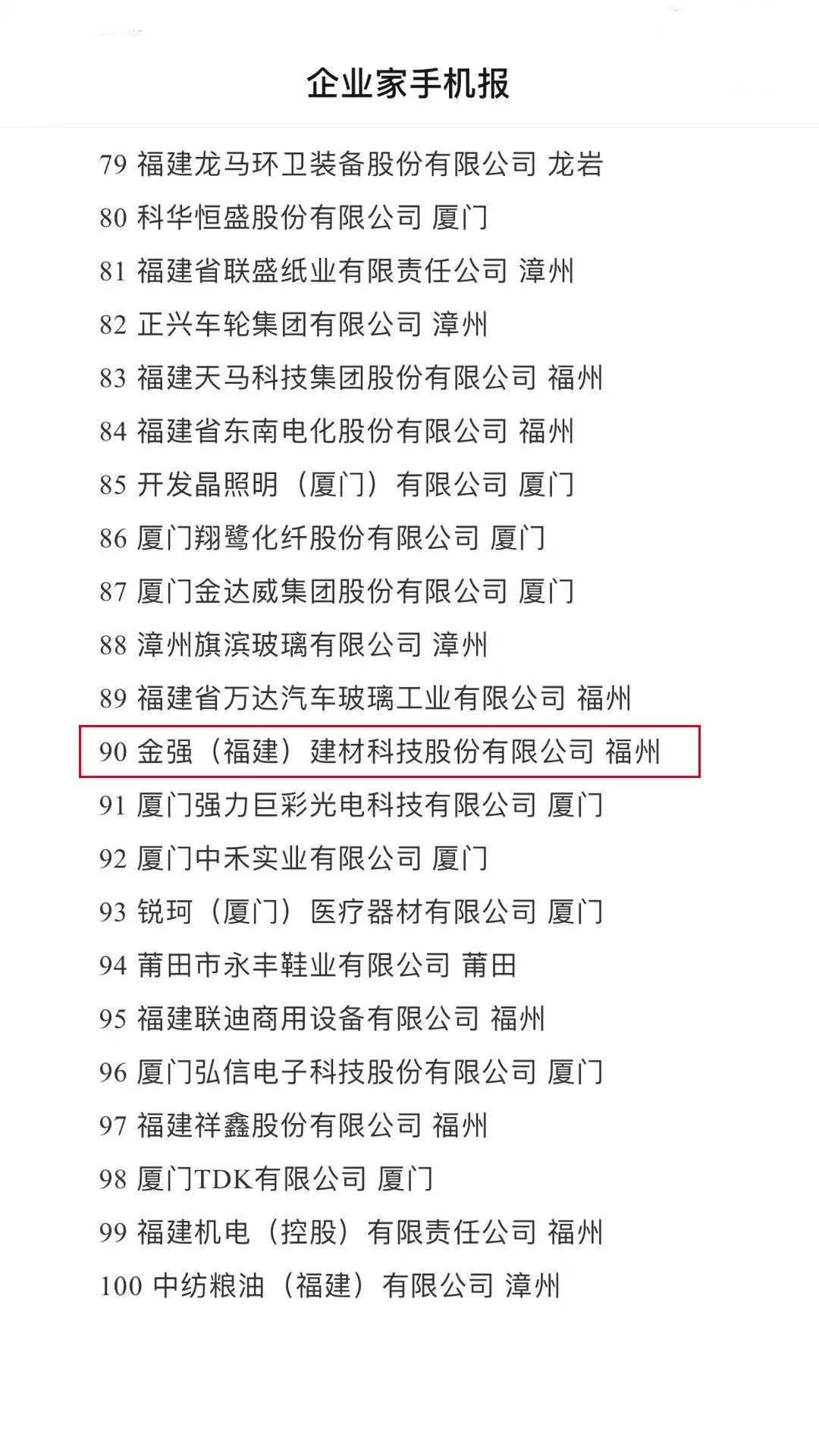 2019年10月6日,由福建省企业与企业家联合会、福建省广播影视集团、福建社会科学院,联合评审的“2019福建企业百强”榜单揭晓。金强(福建)建材科技股份有限公司凭借雄厚的综合实力成功入选!