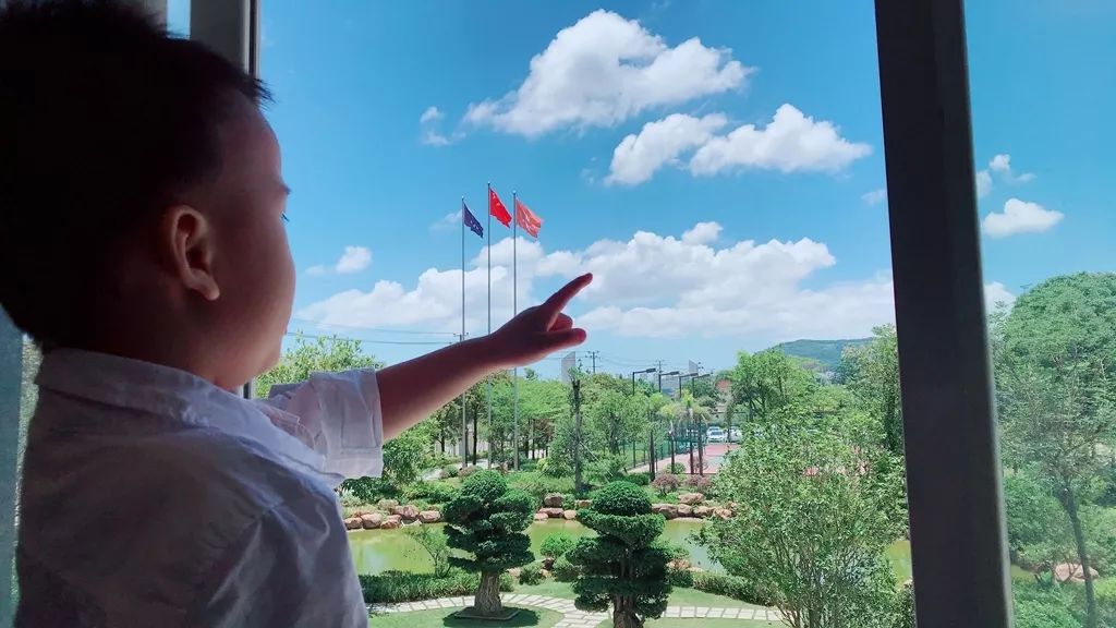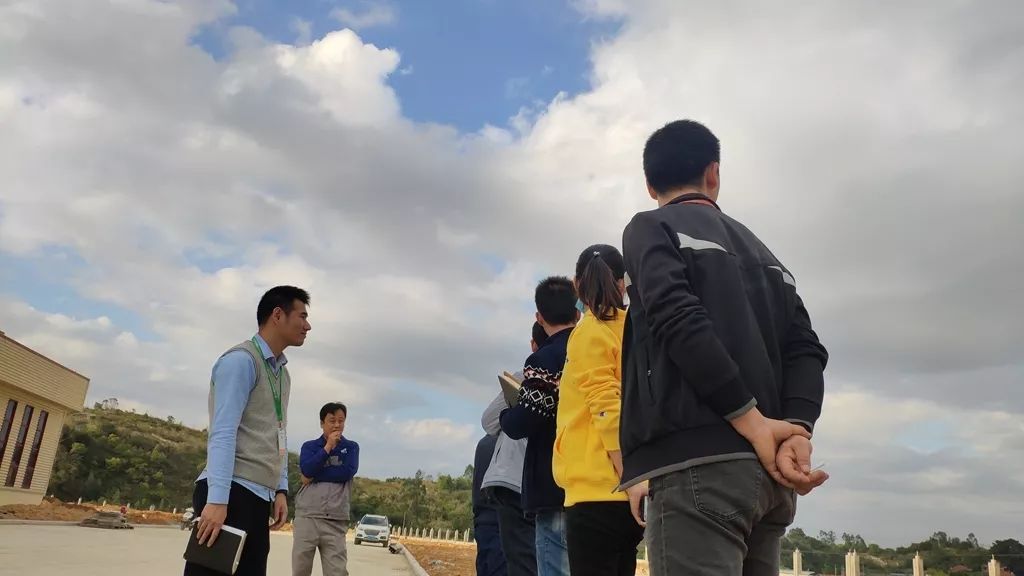 图为精益小组与“和君”老师在金强二部建厂完成后,前往观摩结束后站在厂门外望着厂前的湖泊与天空,趣谈金强二部选了个依山傍水的风水宝地。