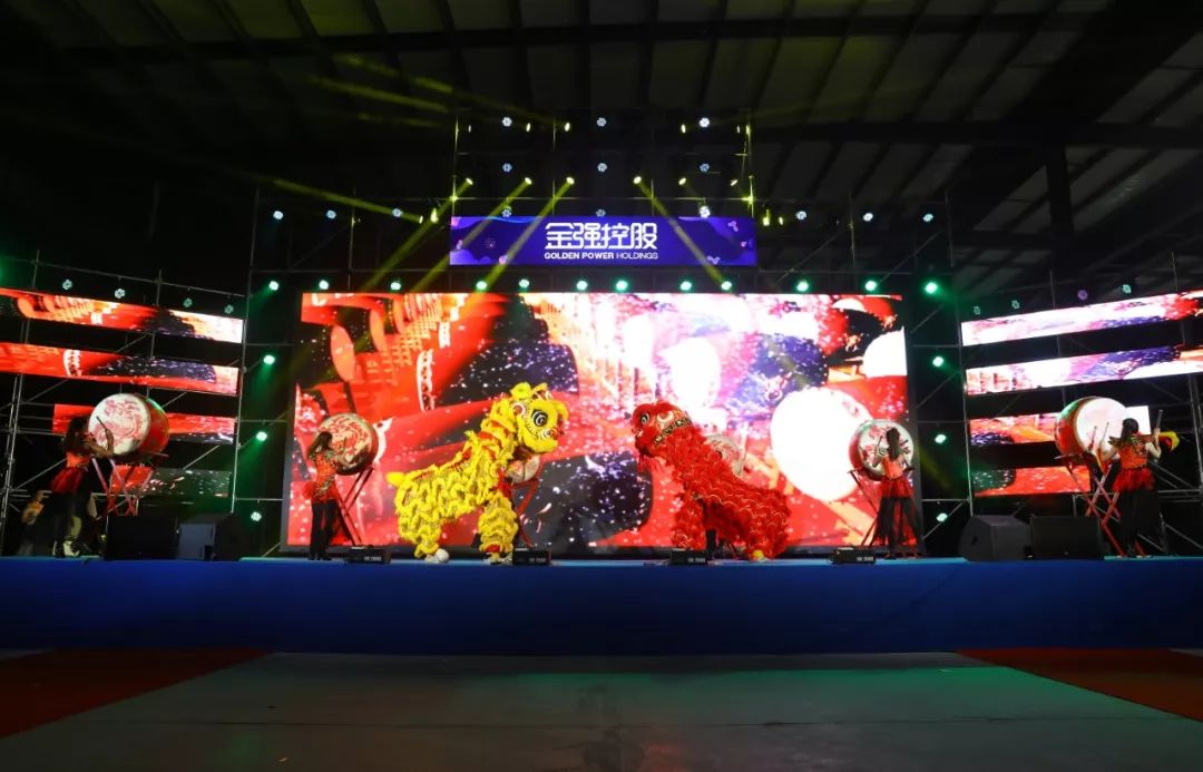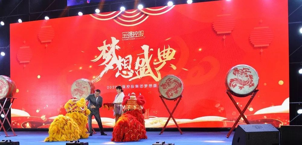 年会随着开场视频拉开序幕,主持人登台宣布梦想盛典正式开始。在开场舞蹈《大鼓舞狮》前,集团总裁翁斌上台为狮子点睛,寓意带来幸福与吉祥,繁荣富贵,梦想成真。