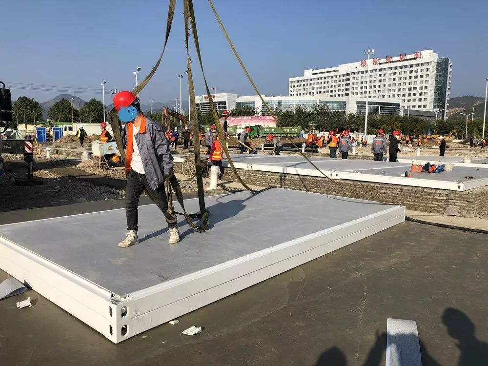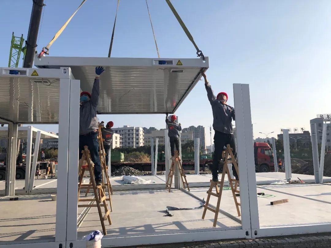 当晚,现场已经完成多个模块化房屋的骨架安装。