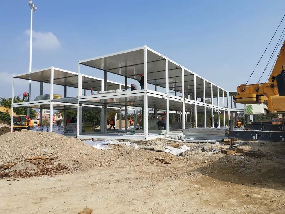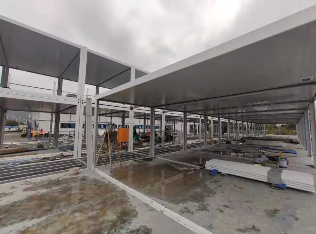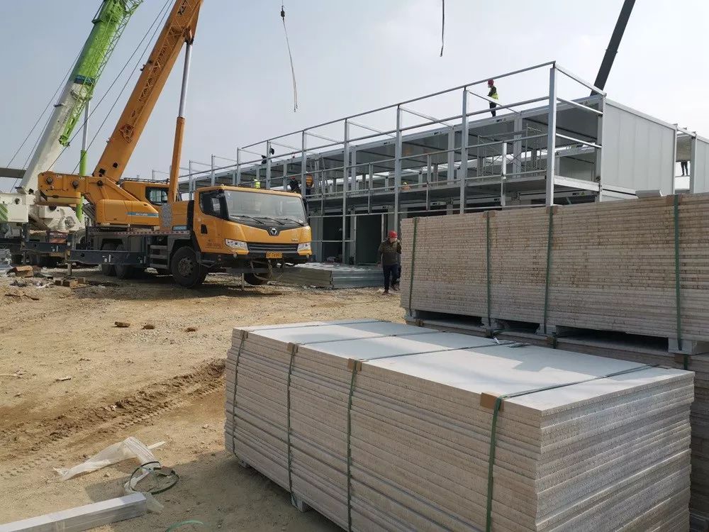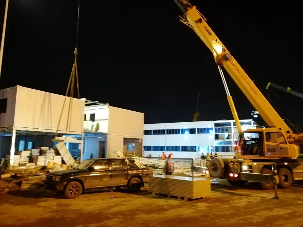 此次项目工期异常紧张,为抢抓时间,在设计图尚未全部完成时,凭借平面图先行施工,在前期土地平整时,挖掘机、推土机、压路机同时作业,数百名建设者在现场忙碌。项目充分发挥装配式建筑的优势,在现场准备前期工作和设计深化时,工厂同时预制产品并运输至现场。在房屋安装时,各工序交叉施工,设备和各单元模块一旦满足进场条件,第一时间跟进安装。