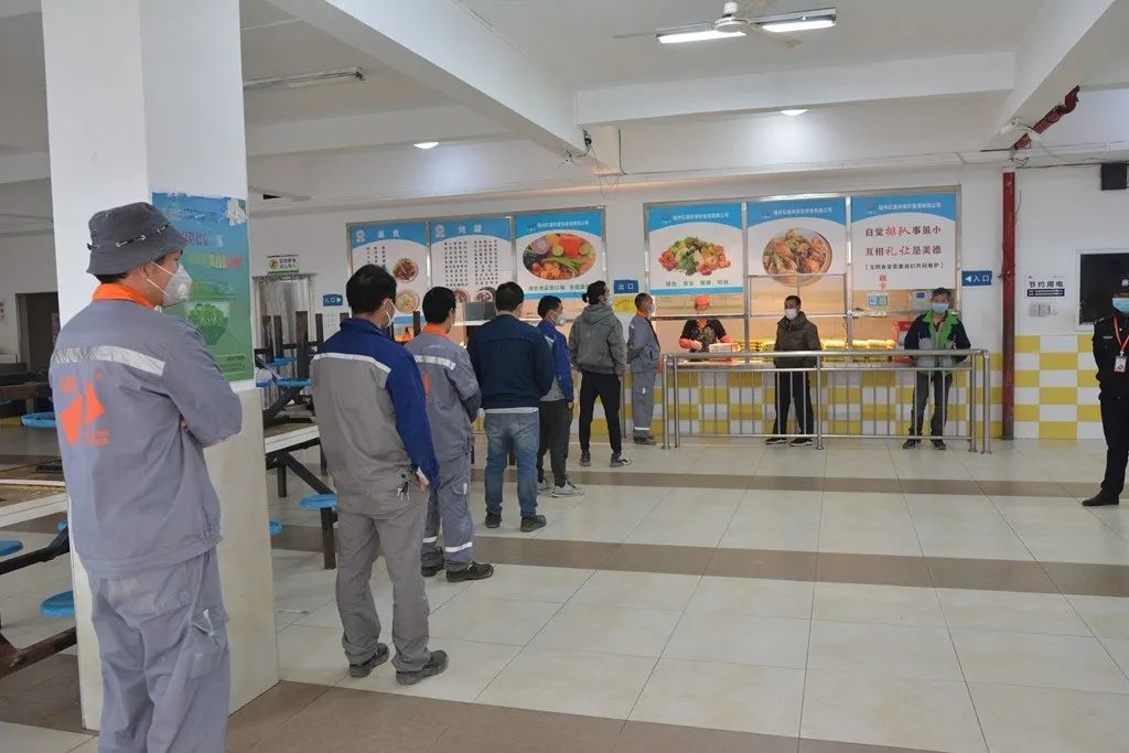 为了避免员工用餐时的健康风险,食堂将堂食形式改成打包形式。在食堂入口处设置专门体温检测点,并要求员工必须佩带口罩,排队打餐时每个人之间必须保持1米以上的间隔。