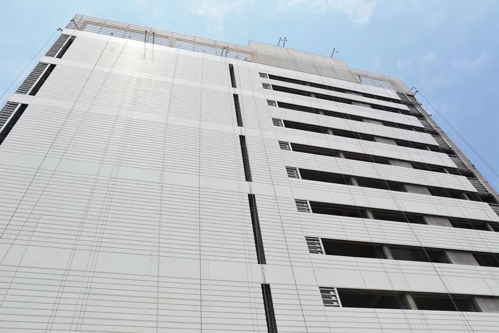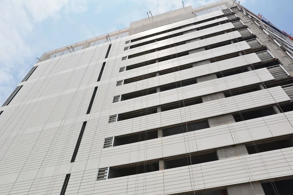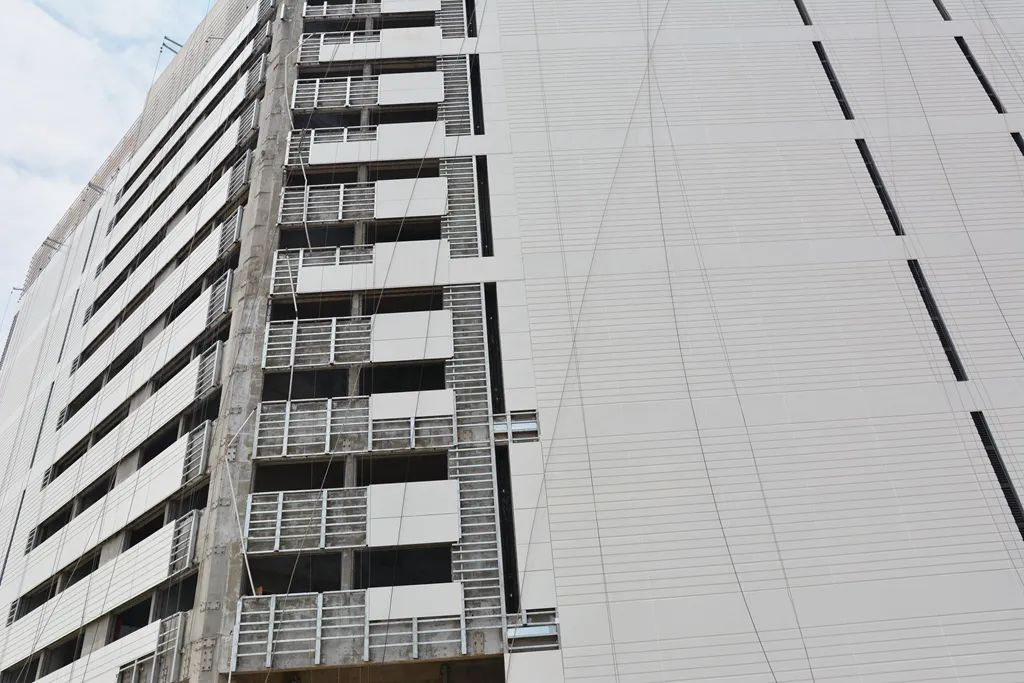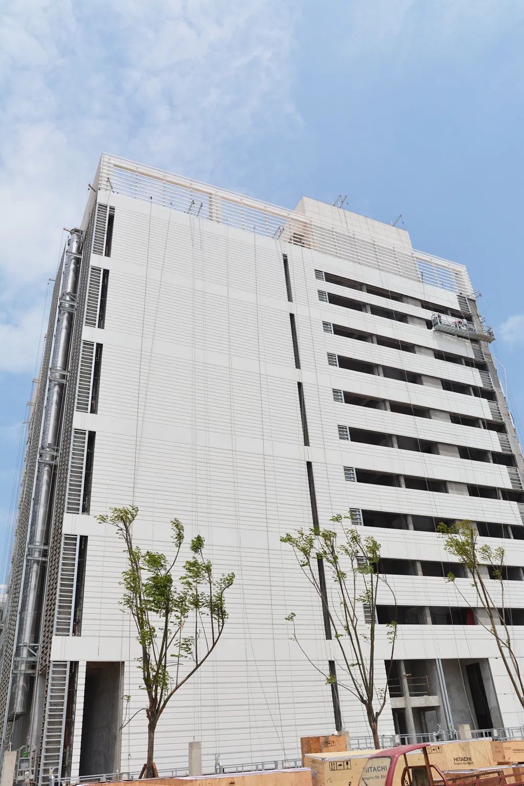 目前,该项目正在进行外立面幕墙施工和室内装饰装修阶段。外墙采用金强PDD白色通体板。