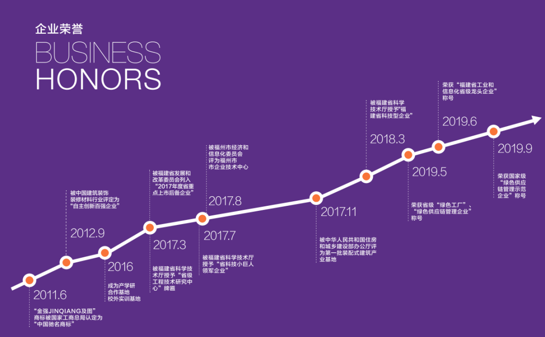 金强建材作为专注装配式建筑系统、绿色新板材系统研发的科技型公司,拥有66项国家发明专利及实用新型技术,先后参与30项国家及地方标准制定。公司为首批国家装配式建筑产业基地、福建省科技型企业,曾先后获得“十二五全国墙材革新创新标杆企业”、“省级(企业)工程技术研究中心”等荣誉称号,是全国建材行业内在自主创新,促进建材行业科技进步和企业创新发展中做出突出贡献的企业之一。
