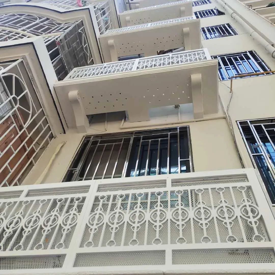 为了与建筑原有的外观风格相融合,嘉同苑小区在外墙安装空调外机平台时,选用了金强雕刻板进行装修。空调外机平台里层采用金属冲孔网板打底,外层采用白色金强雕刻板,雕刻花样根据定制样式采用镂空切割工艺制作而成。