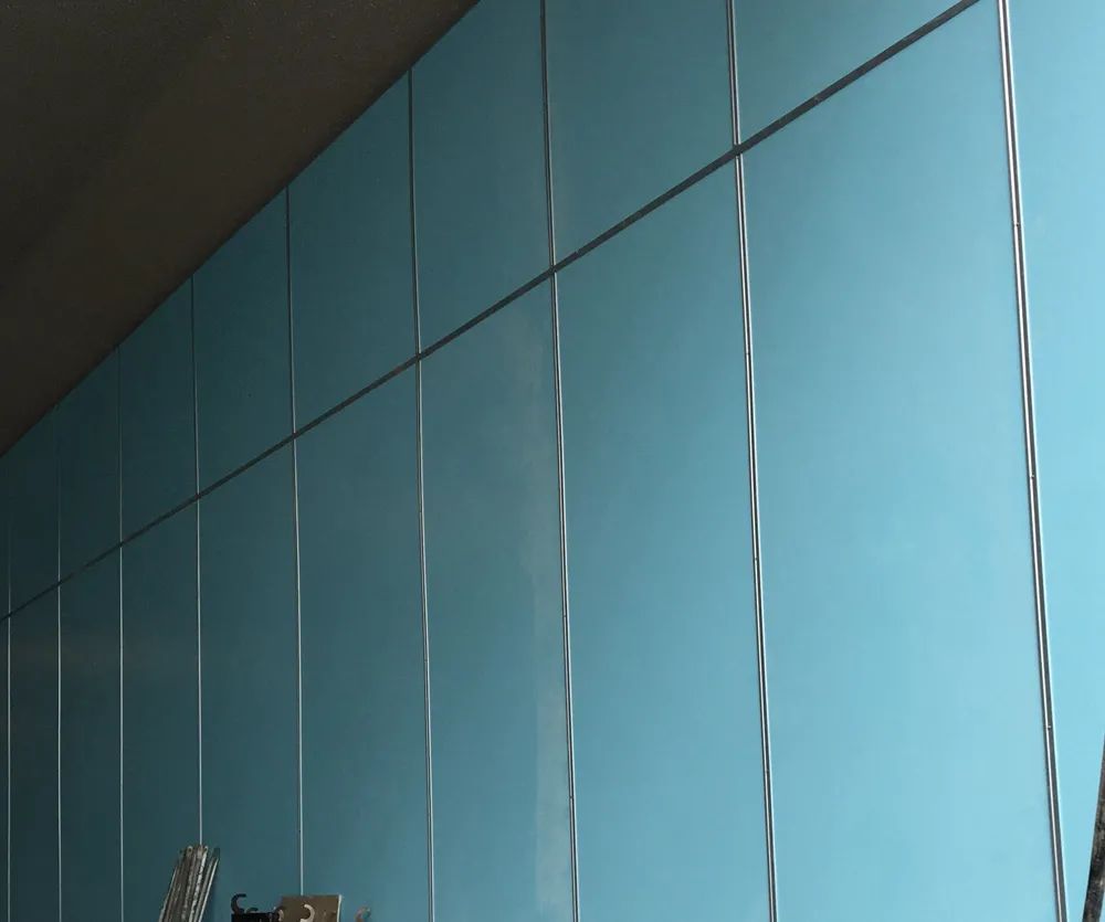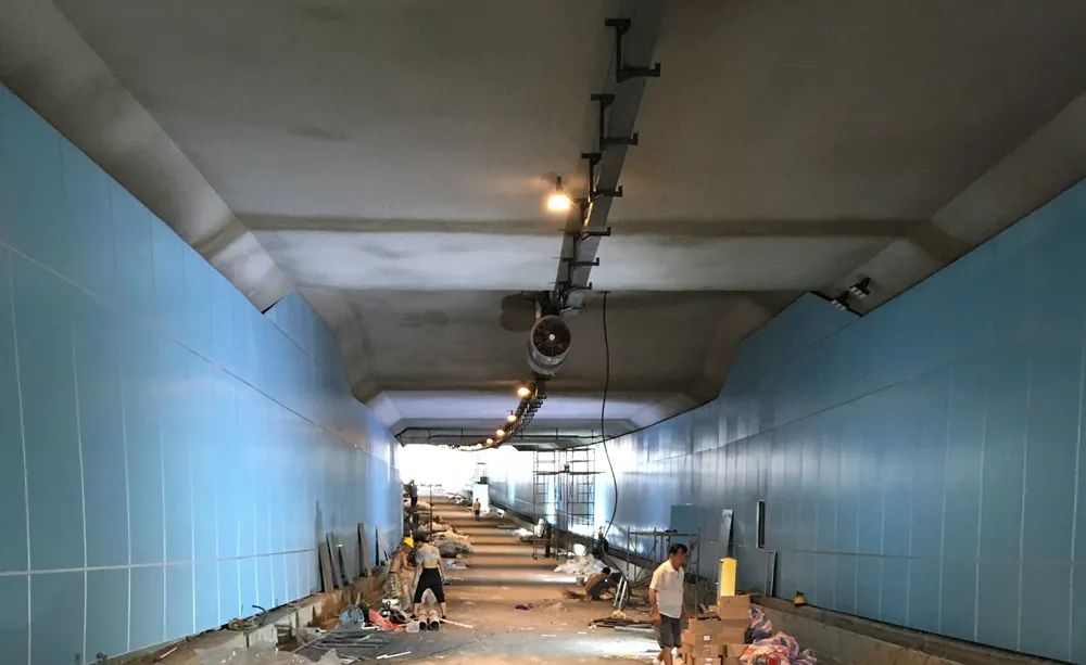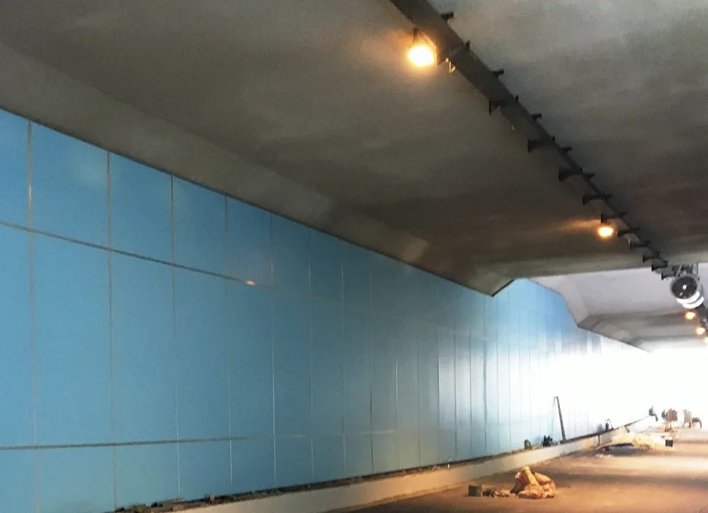 此次杨洪路口下穿通道采用水蓝色的金强ETT装饰板安装隧道两侧,原本较为阴暗幽闭的隧道内,两侧清爽的水蓝色隧道壁让人眼前一亮,不仅美观,还可舒缓隧道环境带来的压迫感。